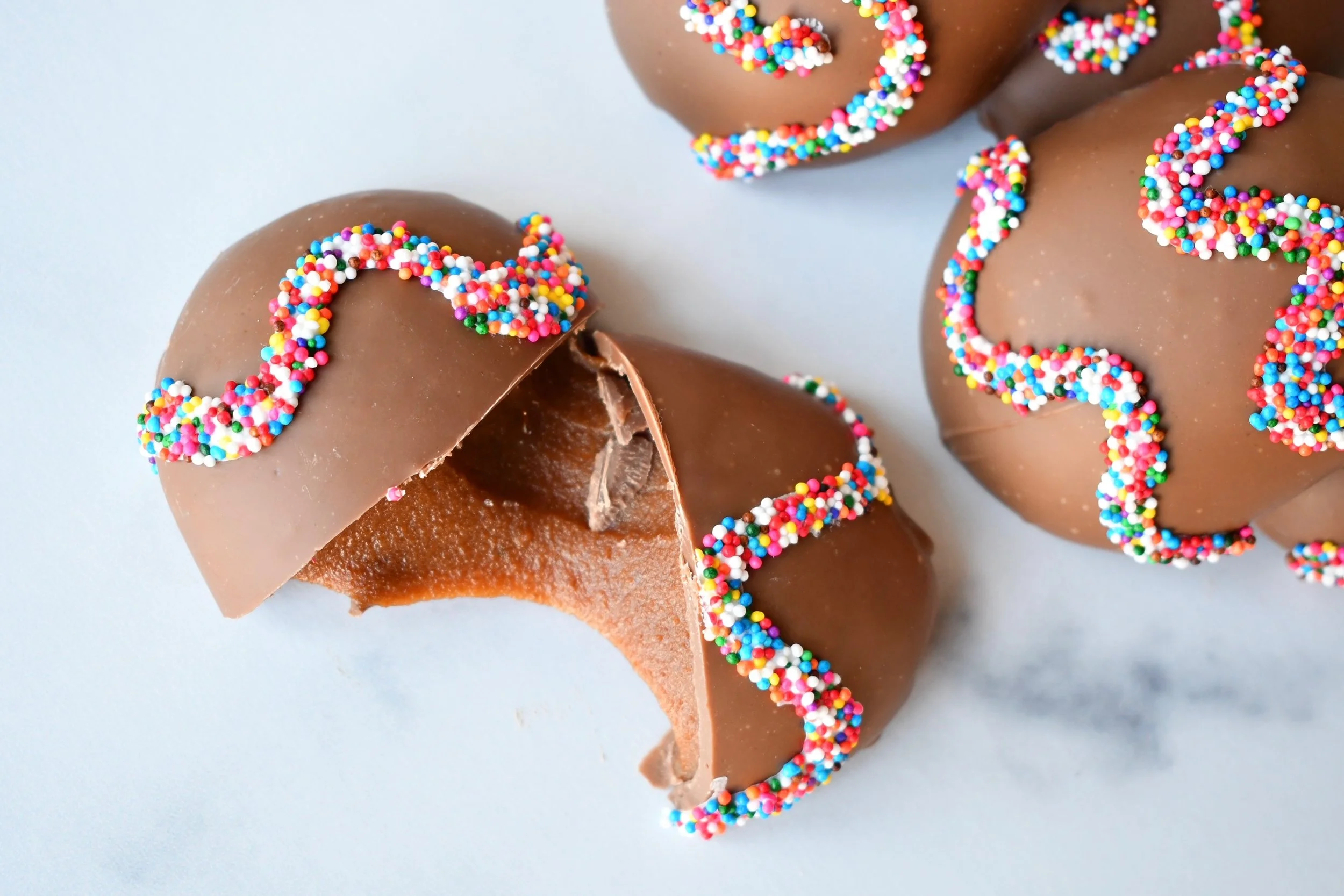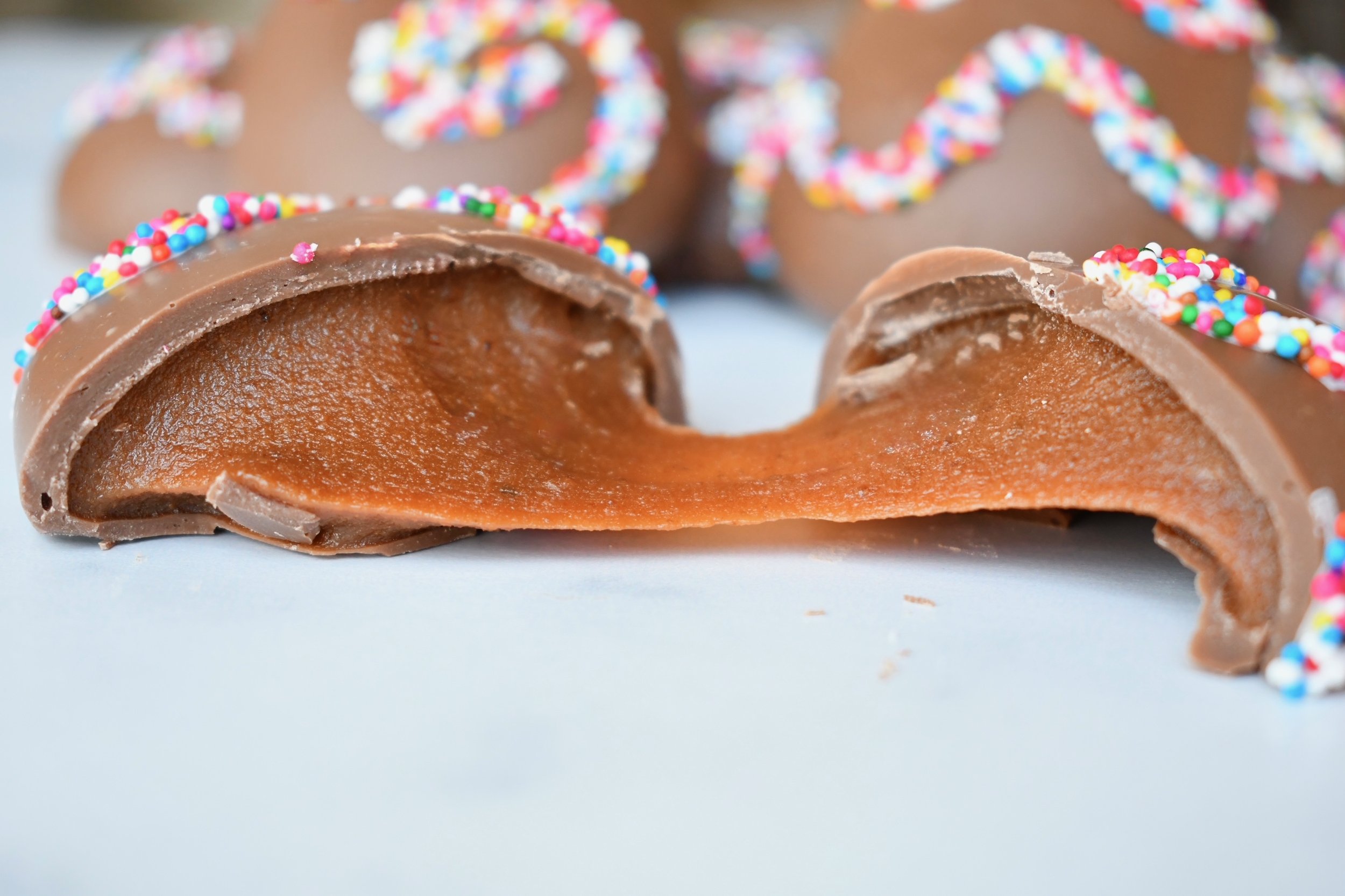 Our signature Caramel Easter Egg features ¼ lb of rich, homemade caramel filling within a milk or dark chocolate shell.