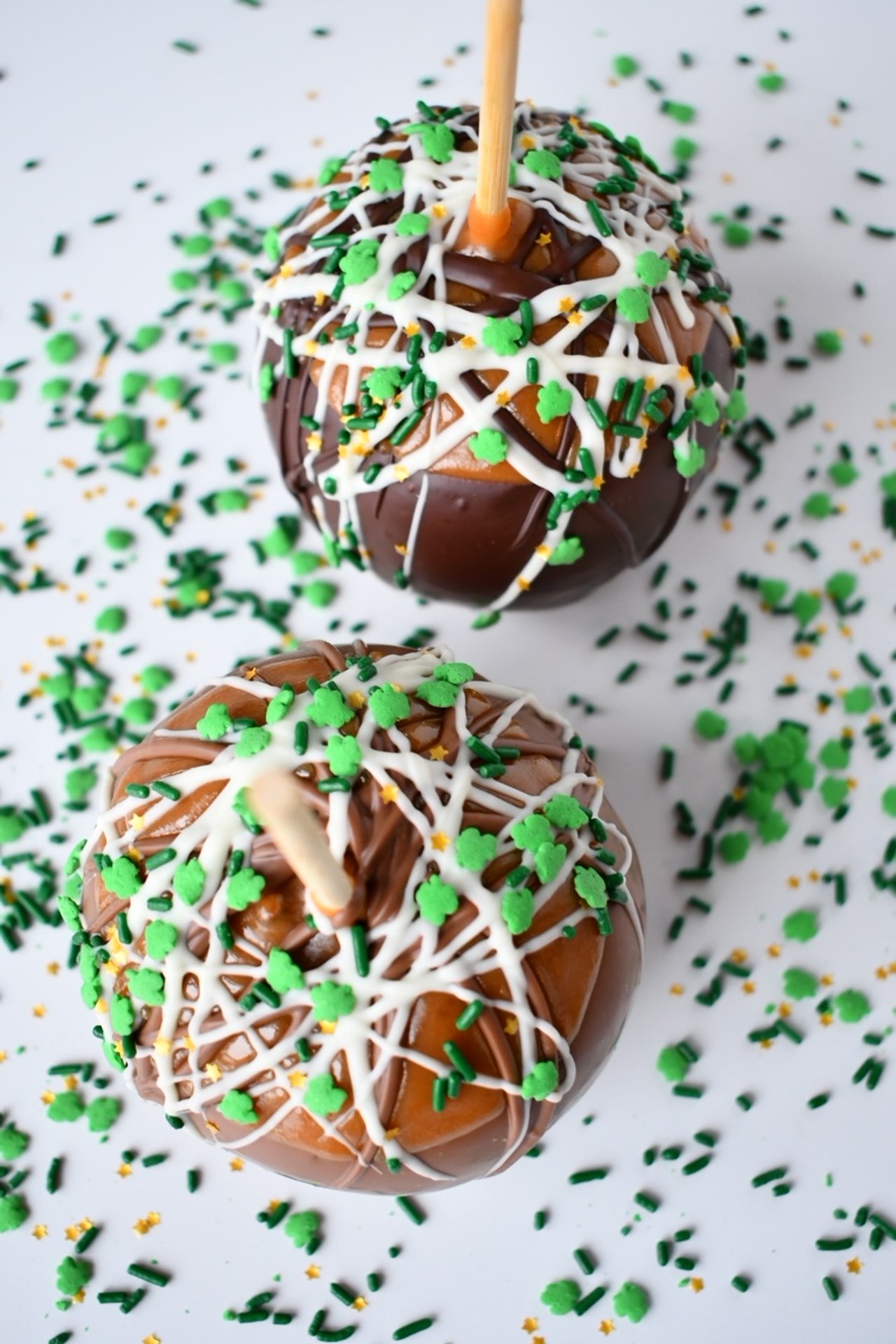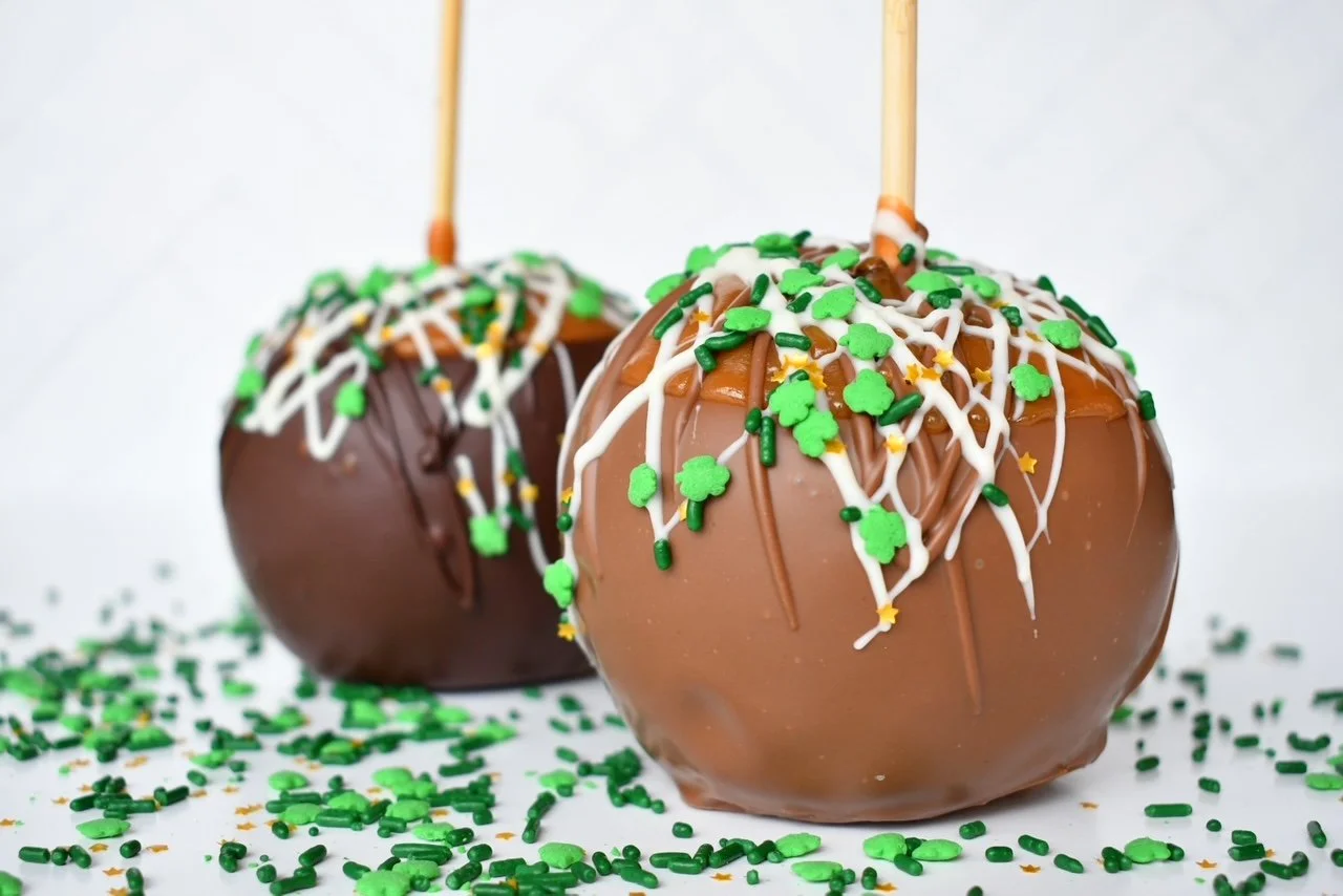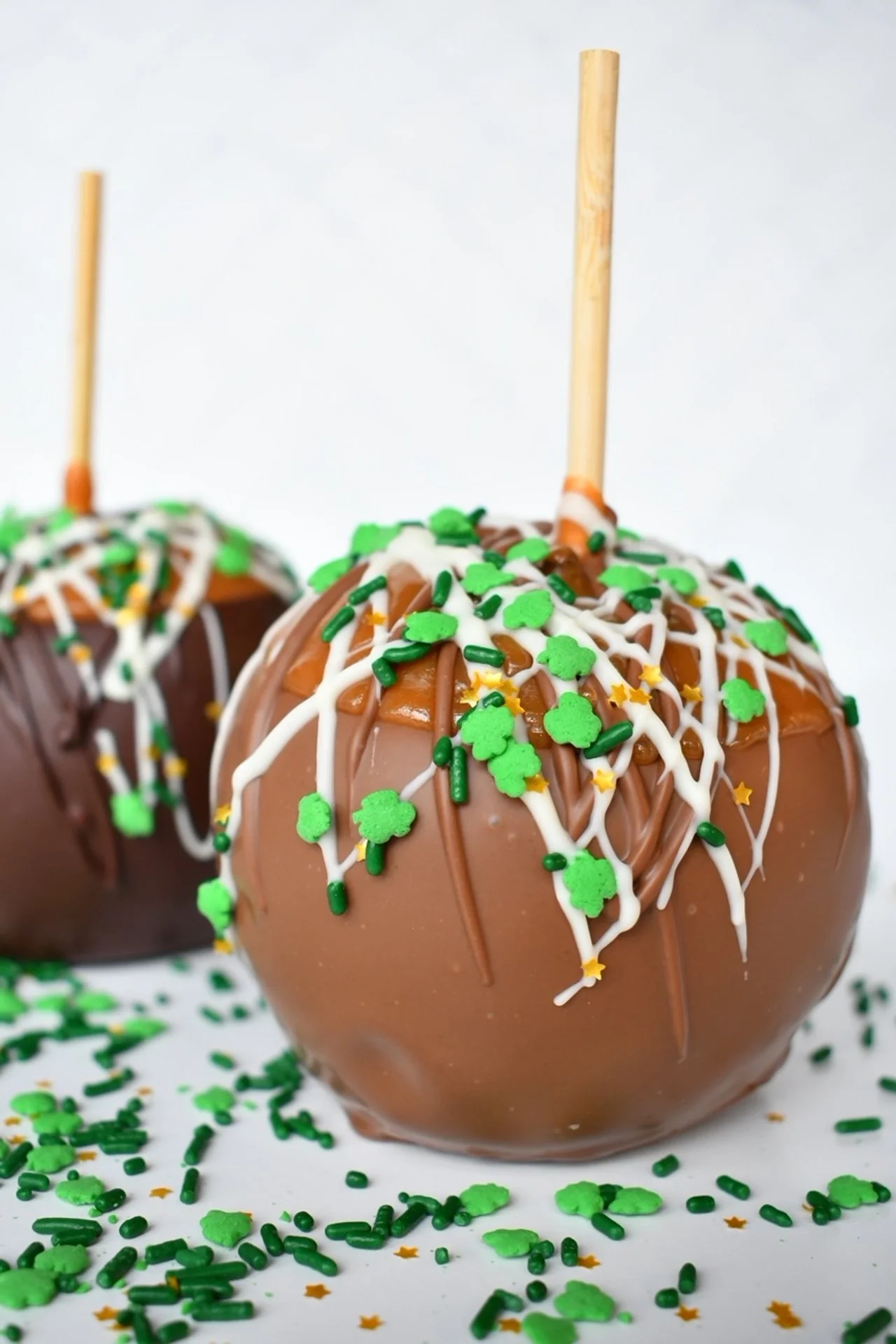 A tart Granny Smith apple, smothered in our signature caramel, dipped in milk or dark chocolate, and sprinkled with festive St. Paddy’s Day sprinkles.