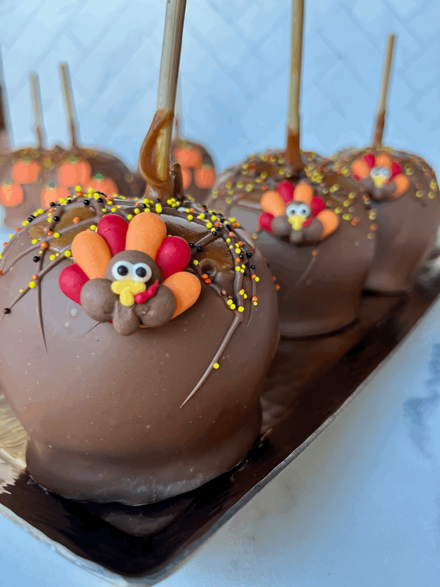Celebrating Thanksgiving with our special Granny Smith apple, dipped in our luscious homemade caramel and coated in creamy milk chocolate. Each apple is adorned with a festive turkey decoration, adding the perfect touch to your holiday table.