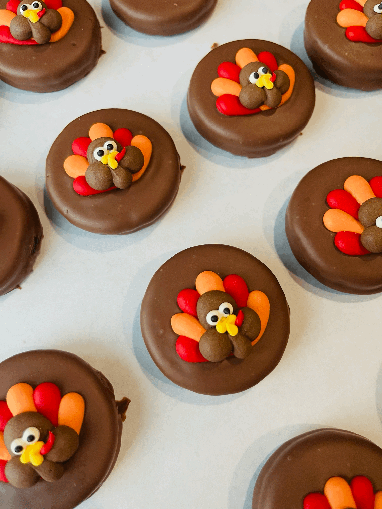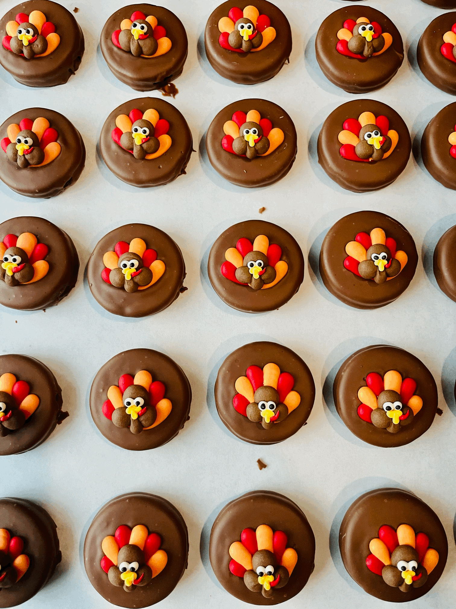 Our classic chocolate covered Oreos are topped with a festive Turkey. Perfect treat to add to your Thanksgiving table!